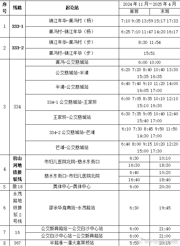 寧波公交集團發(fā)布消息,從11月1日起,寧波公交開始實行冬令時刻,部分線路首末班時間進行調(diào)整。具體如下: