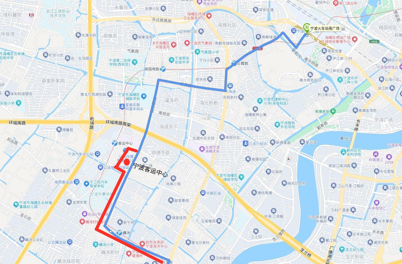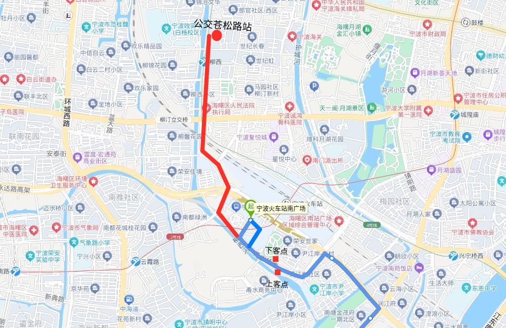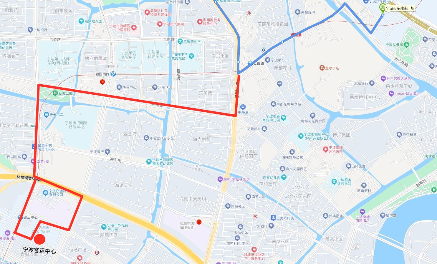 。ǘ┏蜂N部分麗園南路、新典路、環(huán)城西路、恒春街、蒼松路、甬水橋路走向及寧波火車站南廣場始發(fā)站。