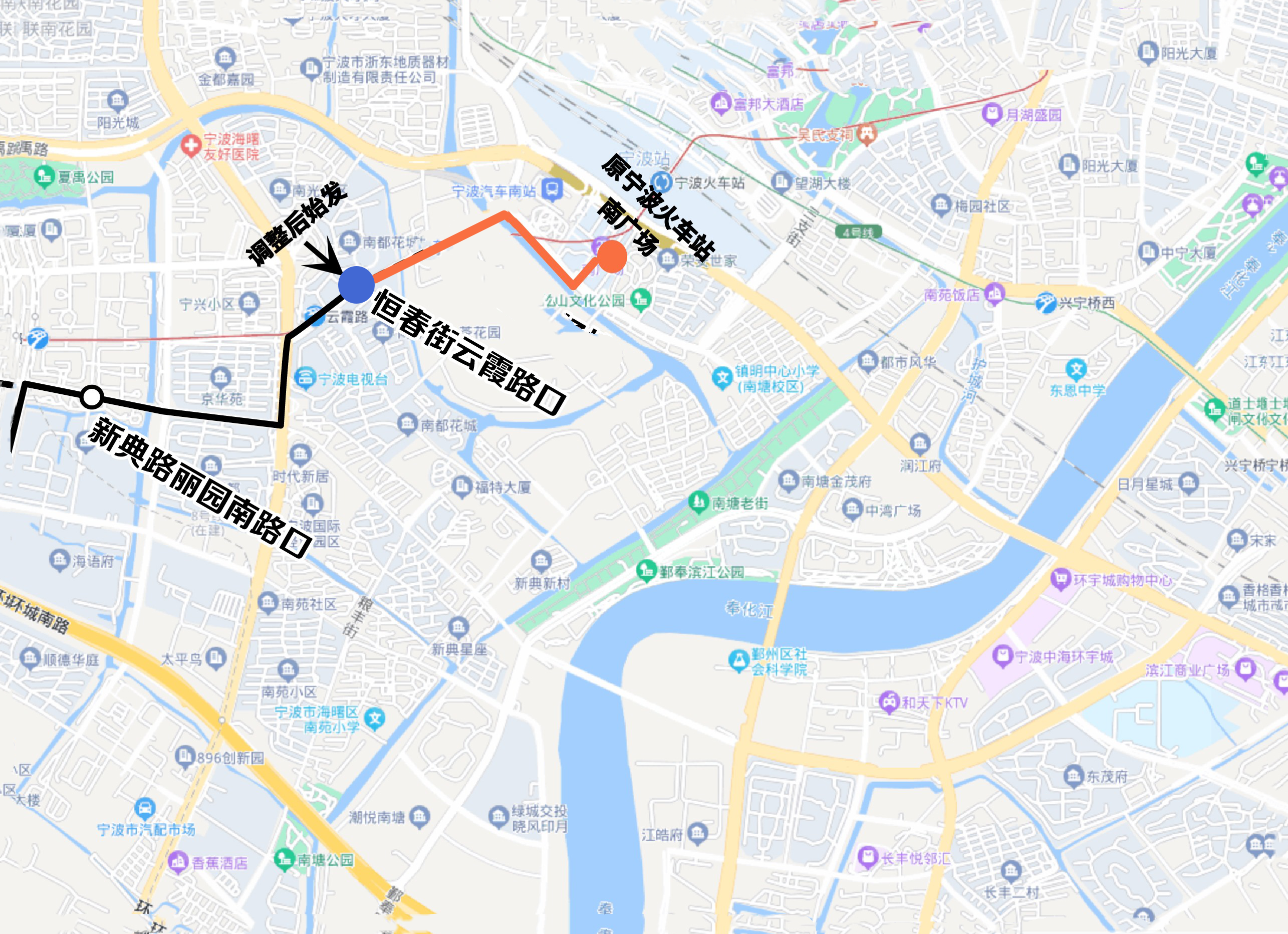 。ǘ┏蜂N恒春街、蒼松路、甬水橋路走向及恒春街云霞路口站,同步撤銷寧波火車站南廣場始發(fā)。