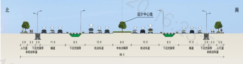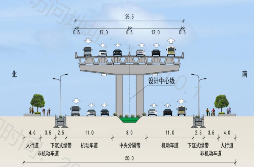 快速路主線(xiàn)布置為雙向6車(chē)道,設(shè)計(jì)車(chē)速為80公里/小時(shí);地面輔道建設(shè)規(guī)模為雙向6車(chē)道,設(shè)計(jì)車(chē)速為50公里/小時(shí)。高架段標(biāo)準(zhǔn)斷面寬度50米,地坪段標(biāo)準(zhǔn)斷面寬度88米。
