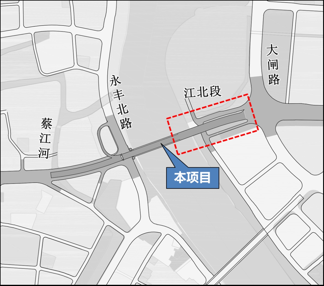 永豐橋拓寬改造工程項目西起蔡家河橋,東至大閘路,全長約750米。西側(cè)引橋長185米,東側(cè)引橋長140米,新建匝道橋長56米,主橋長268米。拓寬后,橋面車道規(guī)模為雙向8車道,設(shè)計速度60公里/小時。