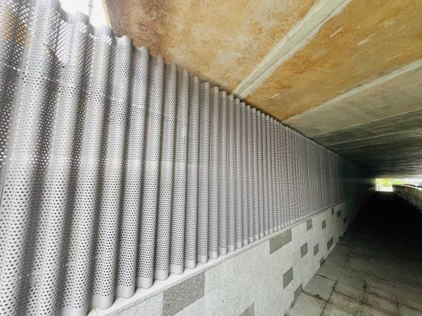 為提升景觀品質(zhì),在下穿通道工程中,市政園林管理科從設(shè)計(jì)到施工實(shí)施全過(guò)程指導(dǎo),在通道入口周邊種植了風(fēng)車(chē)茉莉、迷迭香等花境植物,精心打造綠化景觀。通道內(nèi)墻面采用圓形鏤空金屬板裝飾,既隱藏?zé)魩в衷鎏砻栏,夜間通行更顯溫馨。