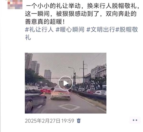 這并非老人第一次用鞠躬致謝——早在今年2月,就有市民偶遇過同款溫暖:“當(dāng)時(shí)老人過馬路,司機(jī)停下來讓他,他特意脫了帽子,對(duì)著車窗鞠了一躬。我特別受觸動(dòng),趕緊拍下來發(fā)了朋友圈,想把這份溫暖分享出去。”