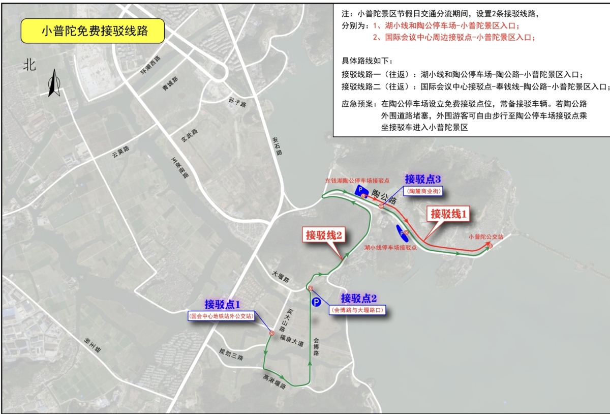 (1)玉泉南路往小普陀景區(qū)方向的自駕游車輛,提前自玉泉南路臨時通道至安石路西臨時停車場,步行至集散中心乘坐公交,或由興凱路、大堰路進入國際會議中心及周邊停車場,此處設(shè)置多個接駁點位(詳見圖小普陀免費接駁線路)。