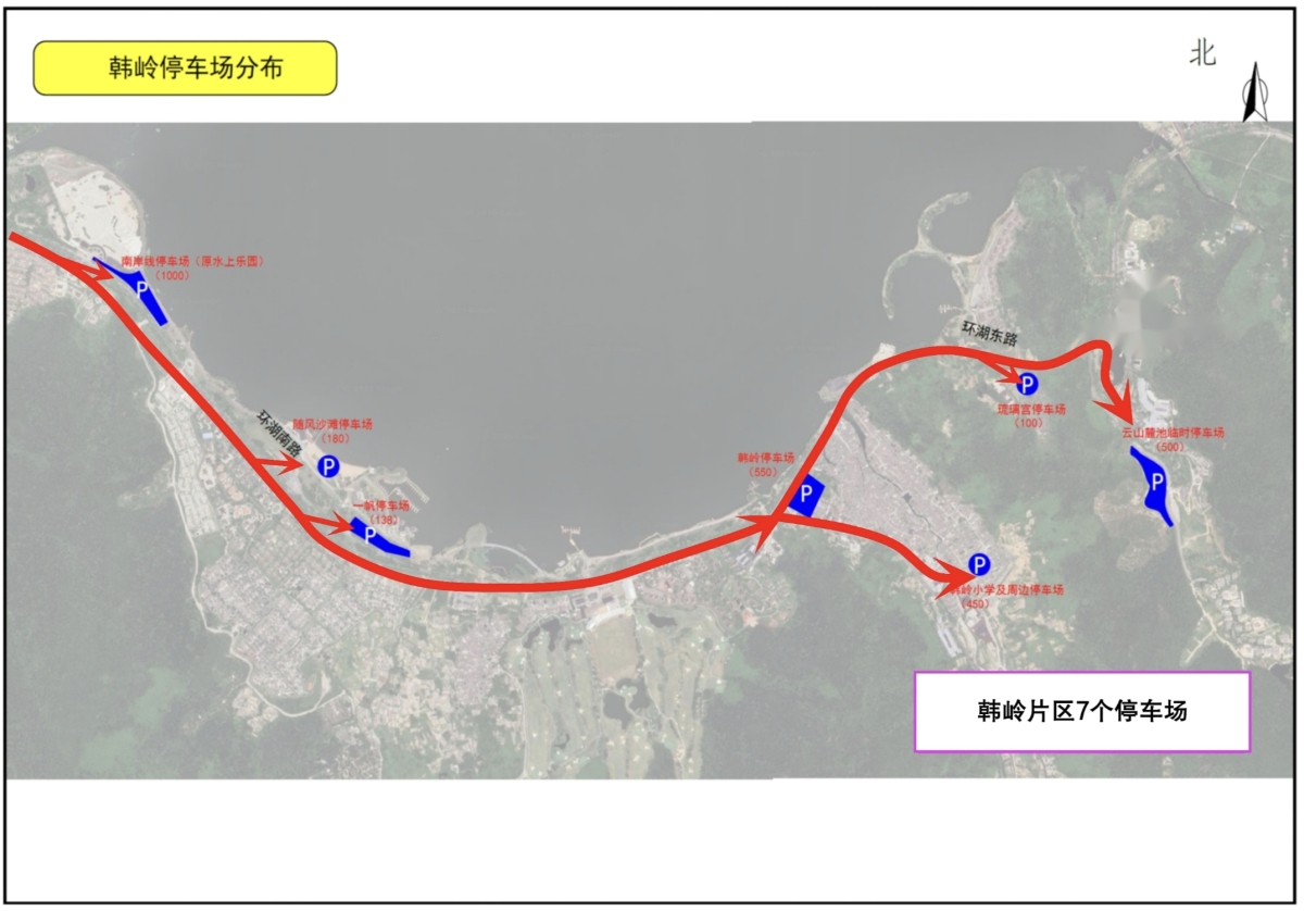3.臨時交通管控。韓嶺老街停車場、云山麓池臨時停車場基本飽和時,將在環(huán)湖東路與環(huán)湖南路路口設(shè)置臨時交通管控點,啟動交通截流和引導(dǎo)措施。自駕游車輛可選擇環(huán)湖南岸線公共停車場、韓嶺小學(xué)公共停車場。