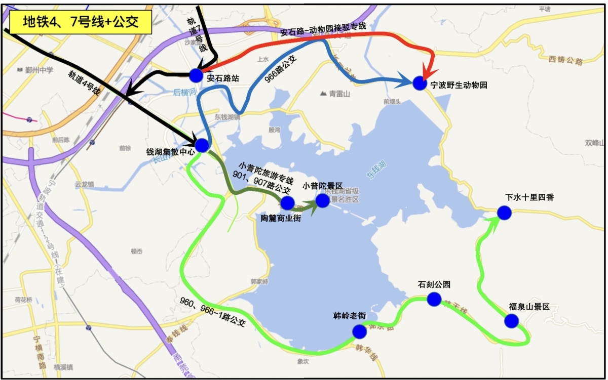 前往中線小普陀、南線韓嶺方向的市民游客,建議在地鐵小洋江站換乘4號線至東錢湖集散中心。