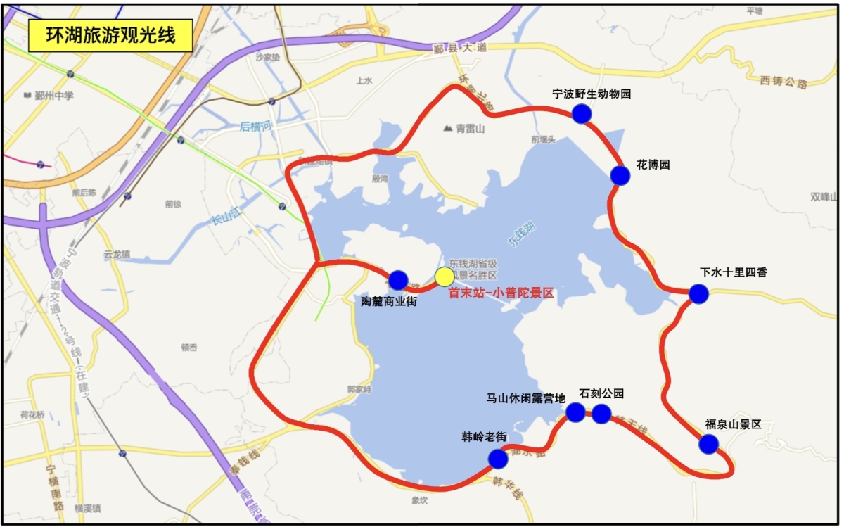 小普陀景區(qū)出發(fā),順時針環(huán)湖一圈,回到小普陀景區(qū),全程約1小時15分鐘,定時定點發(fā)車,日發(fā)4班,時間為8:30、10:30、13:00、15:00,途經(jīng)陶麓、寧波野生動物園、花博園、下水十里四香、南宋石刻公園、馬山休閑露營地、韓嶺老街等。