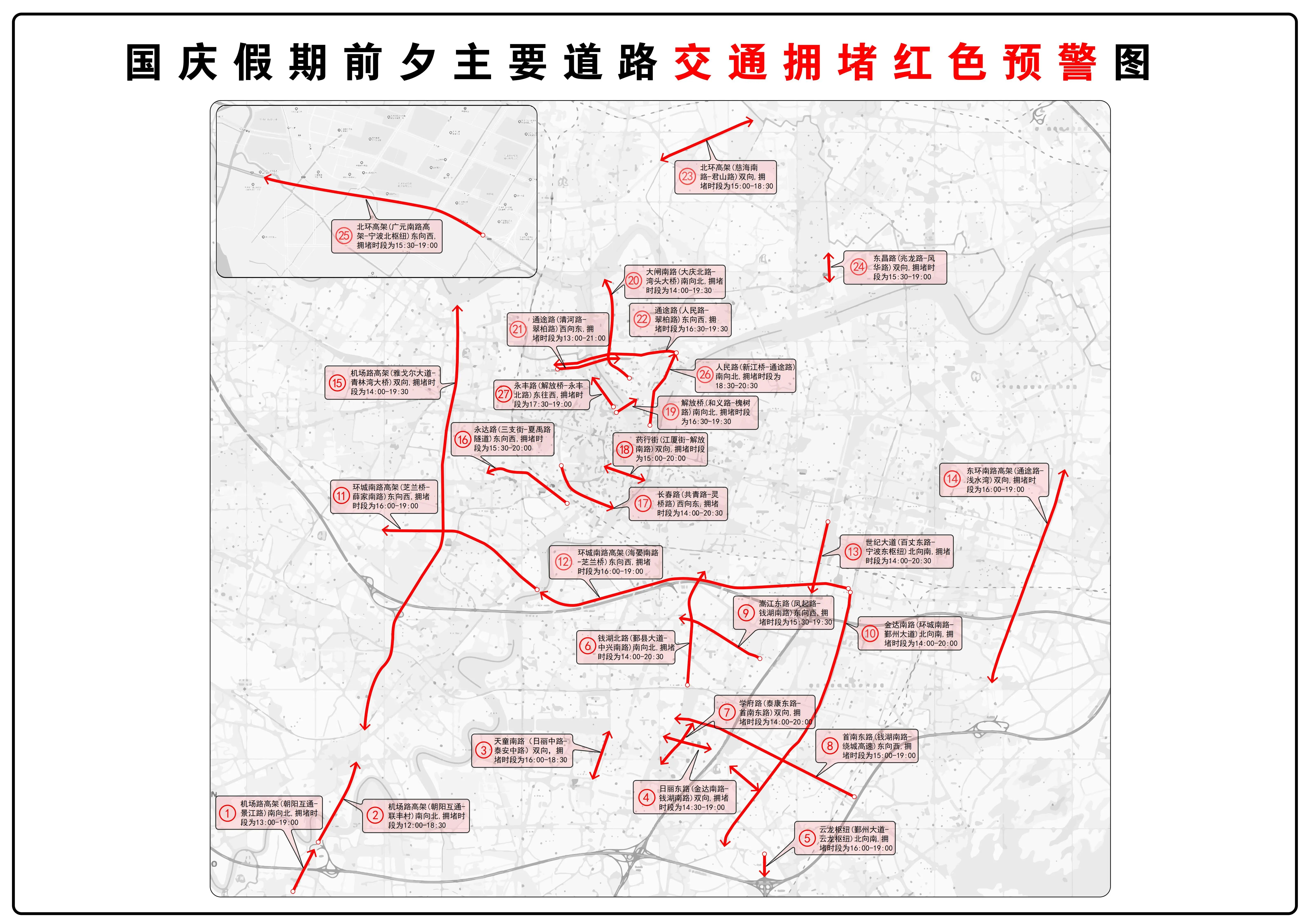 城區(qū)快速路方面,機場高架節(jié)前兩天均會有出城大流量;南環(huán)高架、機場路南延預(yù)計明天下午2點后大流量特征會更加明顯。