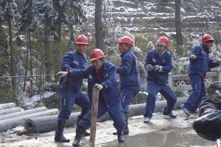 圖為劉建秋同志在今年春季赴江西遂州抗雪搶險(xiǎn)(中間拄木棍)