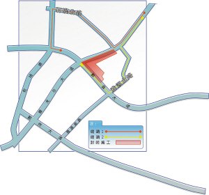 因輕軌2號(hào)線(石碶站)施工需要,鄞縣大道與雅戈?duì)柎蟮?34省道)交叉口于2012年2月14日—2014年12月31日進(jìn)行占道施工。在此期間,鄞縣大道與雅戈?duì)柎蟮澜徊婵诒眰?cè)路段,約305米長(zhǎng),東側(cè)車(chē)行道封閉施工,只能確保雙向兩機(jī)+兩非。而該路口東側(cè)北側(cè)道路封閉,西側(cè)非機(jī)動(dòng)車(chē)道需要借人行道通行。