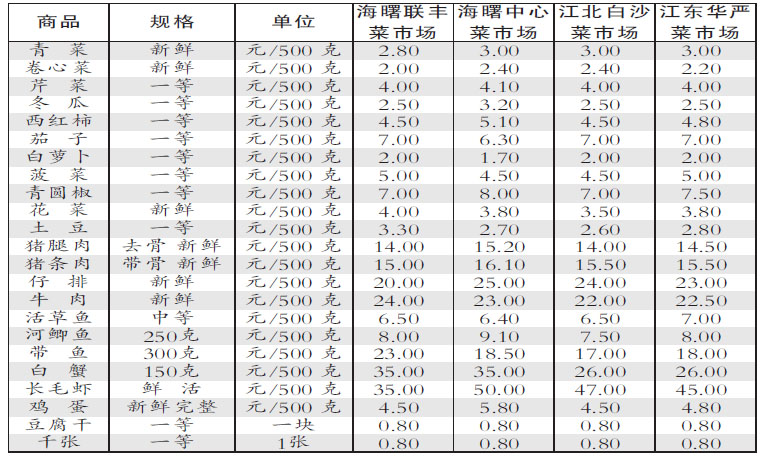本期菜市場(chǎng)商品價(jià)格總水平微幅下跌0.68%。在35種監(jiān)測(cè)品種中,價(jià)格周環(huán)比下跌的有12種、上漲的有9種、持平的有14種。從種類(lèi)來(lái)看,蛋、魚(yú)、肉、蔬菜類(lèi)均價(jià)分別下跌3.50%、1.60%、0.90%、0.51%;豆制品類(lèi)均價(jià)上漲0.11%。從具體品種來(lái)看,菠菜、青瓜、長(zhǎng)毛蝦、白蟹、花菜價(jià)格分別下跌9.32%、8.75%、5.41%、4.76%、3.89%;茄子、冬瓜、土豆價(jià)格分別上漲6.42%、4.11%、3.50%。