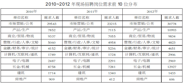 2010-2012年現(xiàn)場(chǎng)招聘崗位需求前10位分布