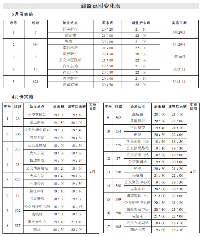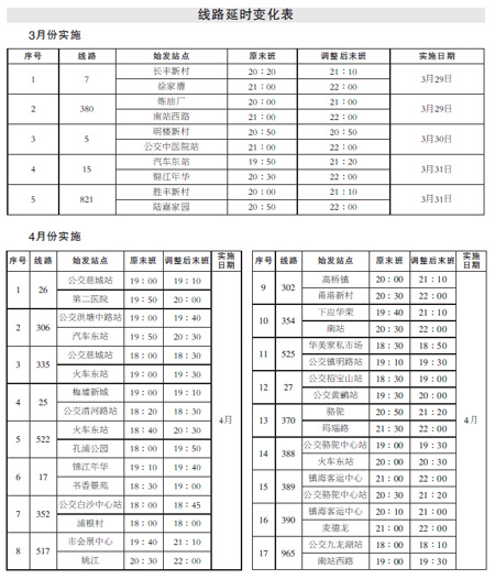 首批線路發(fā)車時(shí)間延長(zhǎng)幅度在10分鐘至90分鐘之間,平均延長(zhǎng)服務(wù)時(shí)間40余分鐘。22條線路中延時(shí)最長(zhǎng)的15路每天將延長(zhǎng)服務(wù)時(shí)間90分鐘。15路(汽車東站—錦江年華),現(xiàn)在從汽車東站方向到錦江年華末班發(fā)車時(shí)間為19:50,調(diào)整以后收車時(shí)間延后到21:20;錦江年華到汽車東站方向末班發(fā)車時(shí)間從20:30調(diào)整到了22:00。