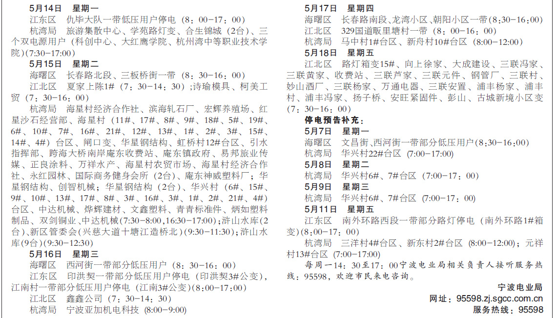 寧波電業(yè)局5月14日-18日計(jì)劃停電預(yù)告
