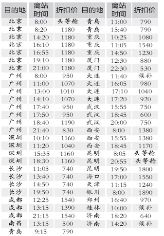 注:按中航信電腦截至昨日16點(diǎn)的信息編制,僅供參考,以上價(jià)格均不含稅。24小時(shí)售票熱線(xiàn):88886666、88887777、13336668686,市區(qū)內(nèi)免費(fèi)送票。