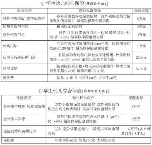 對比兩個方案發(fā)現(xiàn),盡管保障額度各有側(cè)重,但是兩種承保方案的保費(fèi)是一樣的,大學(xué)生為60元,中小學(xué)生為80元,幼兒園幼兒為100元。