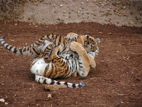 寧波手機報讀者139****8094:在上海野生動物園里,偶看見一大一小老虎在地上抱成一團,貌似在打架!仔細一瞧,原來是虎媽虎兒在嬉耍!盡享天倫之樂呢!