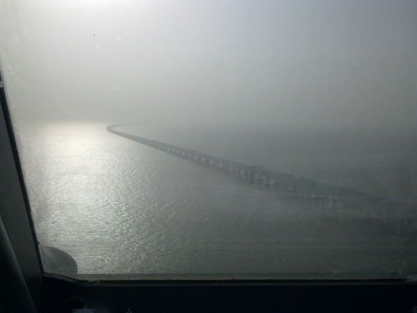 從海天一洲的最高處看杭州灣跨海大橋,像條巨龍臥在海面上,美極了!