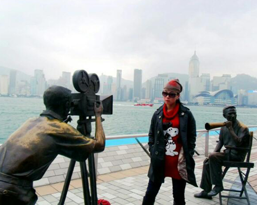 一游客在維多利亞港灣的星光大道上也過了一把“明星”的癮!哈哈!假的也能讓游客“給力”喲!