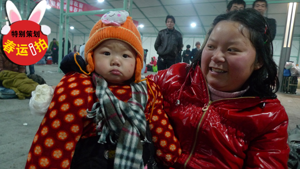 張雪媛抱著10個月大的兒子在寧波火車東站臨時候車大棚等車。