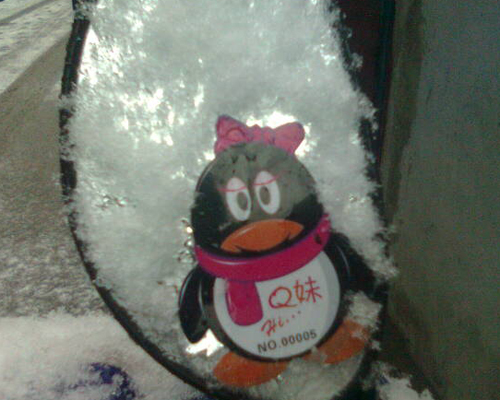 又下雪了,雪景真美!這是我貼在反光鏡上的Q妹,不一會(huì)兒上面就積了一層薄薄的雪。大家看,漂亮吧?
