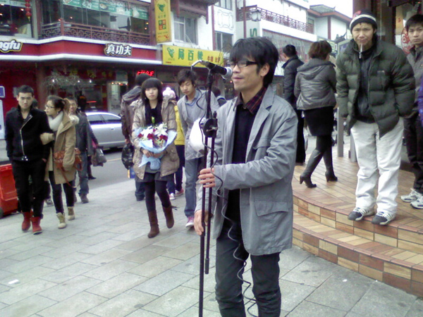 中國寧波網(wǎng)手機(jī)記者134****7350:今天是個浪漫的節(jié)日:情人節(jié)!中午外出吃飯?zhí)炜者飄著雪花,路過城隍廟麥當(dāng)勞時被一流浪歌手的“單身情歌”吸引住了,聽他唱得還蠻有種流浪歌手的味道,四圍也圍滿了觀眾......