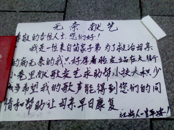 走近一看原來是一個苗家子弟千里迢迢來到寧波這座愛心城市為救治母親的病而站在街頭賣唱希望能得到大家的幫助!被感動的我也捐了一點(diǎn)錢,雖然微不足道,但還是希望這位孝子的母親病能好起來,他的最后一句寫的很好:祝福好人一生平安。。!