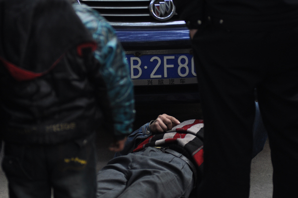 老漢可能是在無人之時躺在車前的,開始也并沒有什么動靜,要不是車主買菜回來準備開車在車前觀察,還真不知道后果是怎么樣?等車主叫老漢時,老漢可來勁了,直到請來交警此事才算平息。