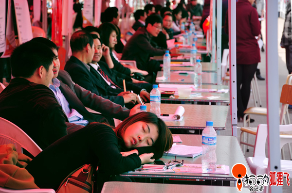 一招聘現(xiàn)場(chǎng),由于人員不多,天氣悶熱,也沒(méi)有看到帥哥前來(lái)應(yīng)聘,一負(fù)責(zé)招聘的美女干脆在現(xiàn)場(chǎng)睡了起來(lái)。。。