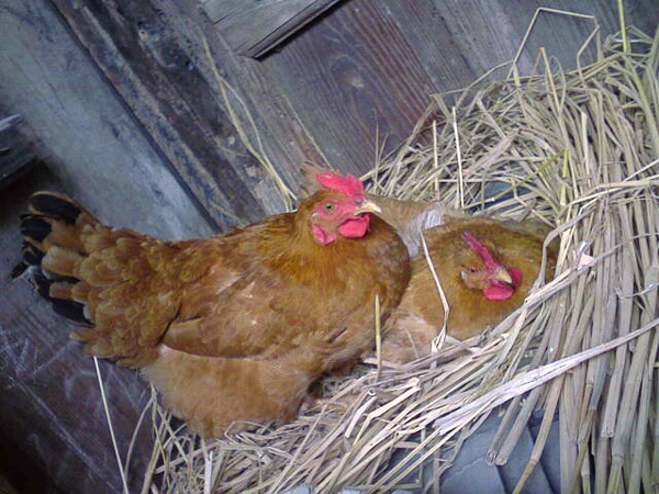 在一農家雞窩,一只母雞正在下蛋,另一只跑過來似乎在說:快點,我也要下蛋!哈哈!