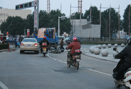 下面請看我在今天上午拍攝的畫面; 出口是從現(xiàn)代商城繞道出行的,交接處的通道口寬不足6m,上班的自行車流、上學(xué)的小學(xué)生、來往的車輛匯合在這陝?wù)揽,真是危機四服、險象環(huán)生。