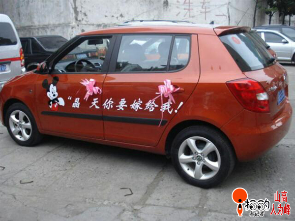 中國(guó)寧波網(wǎng)手機(jī)記者139****8094: 下午在老廟一路邊,遇見停著的一輛桔紅色斯柯達(dá)昊銳小婚車,很有個(gè)性,門上的車貼“晶天你要嫁給我”很是吸引眼球,想必新娘的名字中一定有個(gè)晶字吧,很有意思!哈哈!
