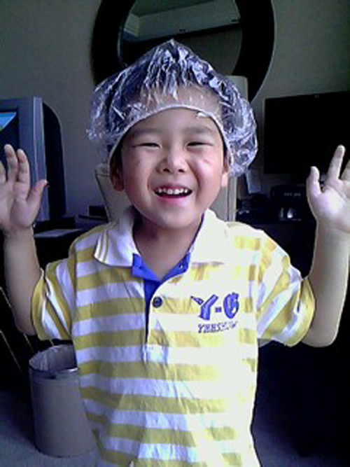 小朋友住賓館,從浴室里找到一個(gè)浴帽,搗鼓一陣,戴在頭上!欣然向我打招呼,真的好可愛(ài)。!