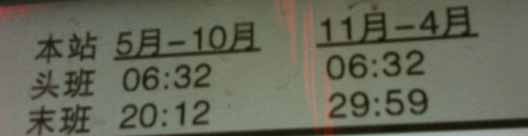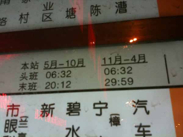 下班路上看到雷人的公交車時刻表!11月到4月的末班車竟然到29:59,地球啥時候改成30小時制了!