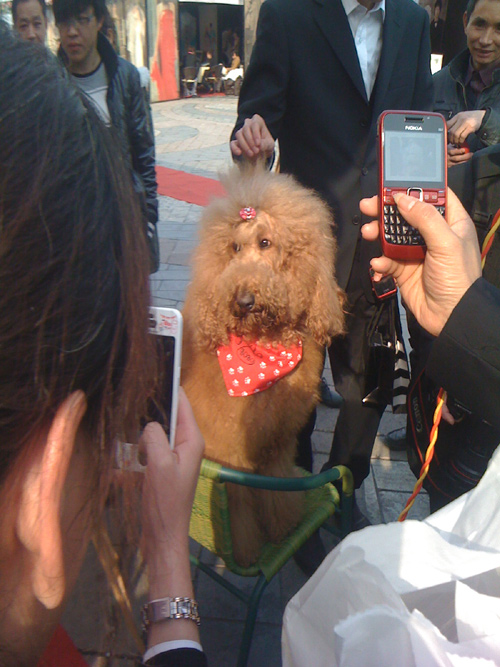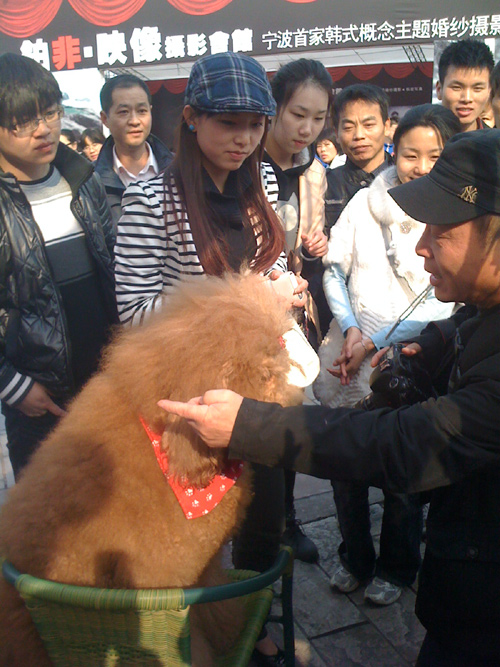中國(guó)寧波網(wǎng)手機(jī)記者135****8178:前兩天在天一廣場(chǎng)舉辦的婚博會(huì)上,一只巨型貴賓犬吸引了大家的目光。據(jù)主人介紹,他養(yǎng)了5年了,狗狗的智力相當(dāng)于6歲小孩。我在現(xiàn)場(chǎng)看到,它能很乖地聽(tīng)主人的話,讓他坐到凳上就坐到凳上,讓他轉(zhuǎn)身就轉(zhuǎn)身,性格真的很好哦!哈哈!