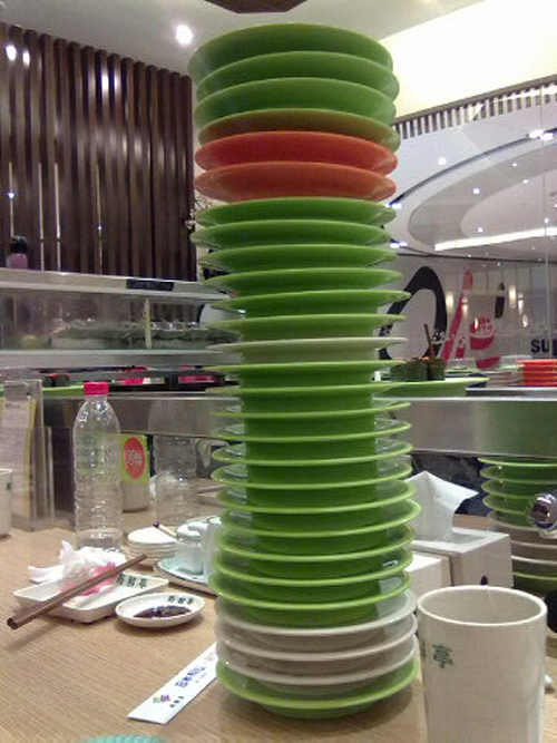 失戀啦,心情極度郁悶!一怒之下跑到一家壽司店,點了一大堆的東東,看看盤子疊的有多高!肚子是吃飽了,問題鈔票要付出一大堆了,哎!這就是失戀后的后果!沖動是魔鬼!