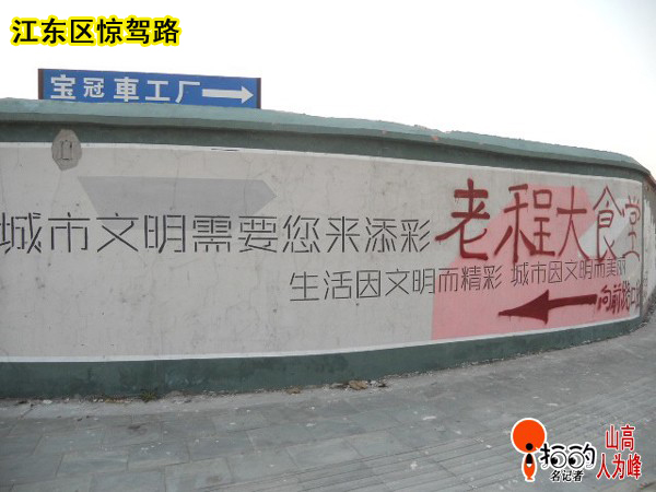“江東區(qū)驚駕路銀晨國(guó)際東邊圍墻的文明宣傳標(biāo)語(yǔ)上,蓋上了一條讓人不舒服的關(guān)于‘老程大食堂’的涂鴉路標(biāo)!