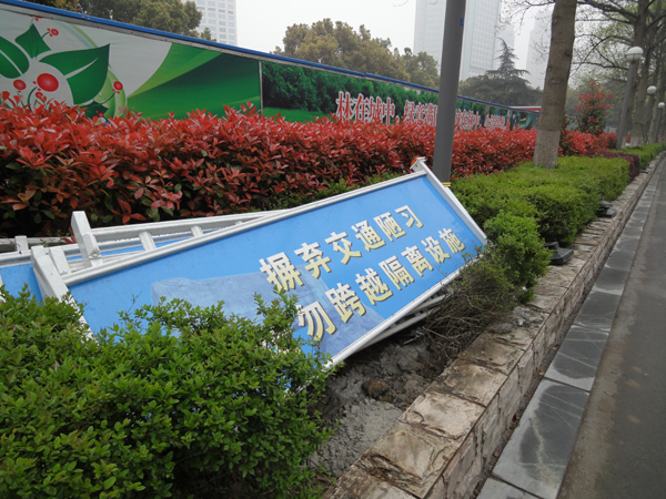 中國寧波網(wǎng)手機記者135****6815:交通隔離欄,本應(yīng)該是用來維護交通秩序、創(chuàng)建城市文明的,現(xiàn)在卻被棄之一旁,壓在了綠化帶上。這一場景與宣傳口號“摒棄陋習(xí)、都市形象”等字眼組合起來,不知道大家作何感想?4月8日中午攝于江廈街!