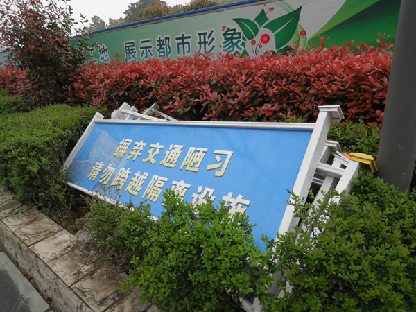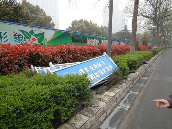 中國(guó)寧波網(wǎng)手機(jī)記者135****6815:交通隔離欄,本應(yīng)該是用來維護(hù)交通秩序、創(chuàng)建城市文明的,現(xiàn)在卻被棄之一旁,壓在了綠化帶上。這一場(chǎng)景與宣傳口號(hào)“摒棄陋習(xí)、都市形象”等字眼組合起來,不知道大家作何感想?4月8日中午攝于江廈街!