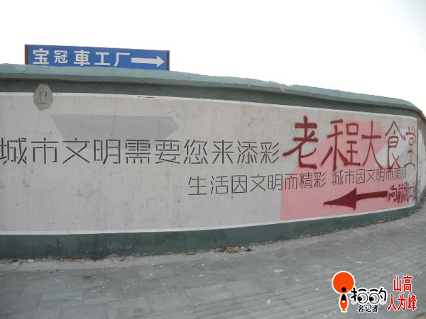 因?yàn)樵瓉?lái)打算撤換墻面的文明標(biāo)語(yǔ),所以先進(jìn)行了初步粉刷,等新標(biāo)語(yǔ)出來(lái)后,會(huì)讓這面墻煥然一新。談到這個(gè)路標(biāo)是否是“老程大食堂”的工作人員寫上去的,是否會(huì)對(duì)他們進(jìn)行處罰?