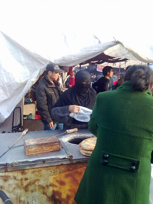 這賣(mài)燒餅的老板娘太可怕了,哎!都春天了,有什么見(jiàn)不得人的,把臉遮擋起來(lái),只露兩只眼睛。可怕……