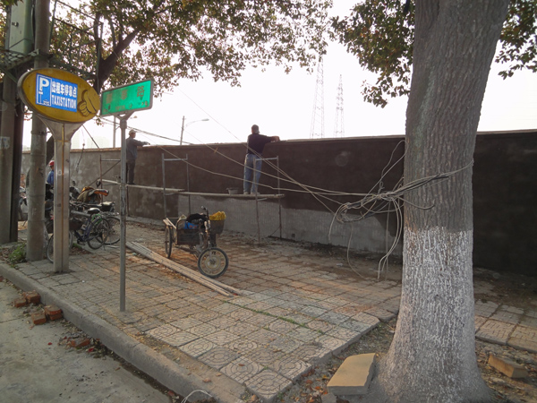 4月14日下午,讀者再次路過此地時(shí),發(fā)現(xiàn)這條路上的通信光纜都已清理,一面的圍墻也已砌好。