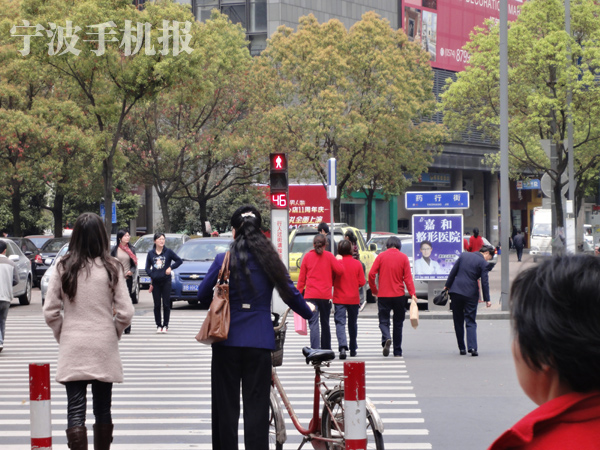 中國寧波網手機記者135****6815:前天中午路過海曙藥行街,剛想穿過馬路紅燈就亮了,于是就停住了!但一些行人卻無視紅燈存在,陸續(xù)往前闖!也有幾位行人素質非常高,嚴格遵守交規(guī)。紅燈停綠燈行,這個小學生都知道的道理,我看有些大人還不如小孩子!你們看,馬路對面紅燈的跳動數字顯得格外醒目!