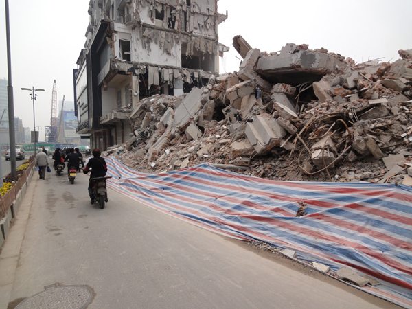 4月9日,讀者135****6815反映,在中山東路新江廈商城對面的拆遷工地上,廢墟如山,塵土彌漫,鏟車不停地運作著,而旁邊就是毫無遮擋窄窄的非機動車道,人車川流,往來不息。經過這里時,大家都會抬眼一望后趕緊逃離,我想,大概是這樣“坦白”的拆遷讓大家實在有點提心吊膽吧!