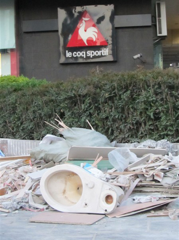 4月13日,讀者138****7027反映,和朋友去E咖啡吃飯,路過江東開元大酒店,對面一家專賣店正在裝修,把裝修垃圾都堆到了人行道上!行人只能繞行,希望能及時清理。