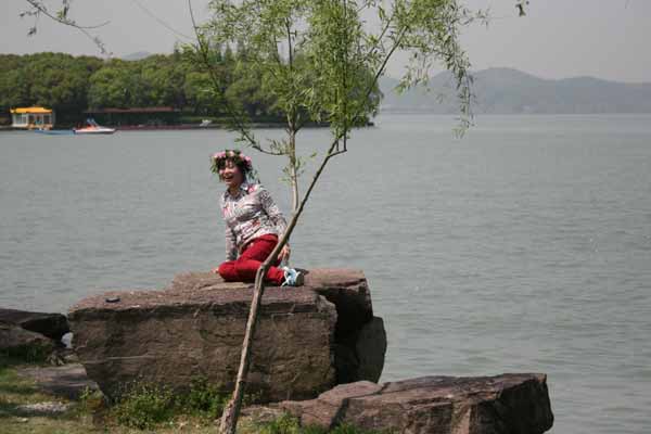 在東錢湖小普陀,一位美女游客坐在湖邊石頭上,擺出一幅丹麥美人魚的姿勢(shì),讓同伴幫著拍攝,口里喊著:“我像不像美人魚?”