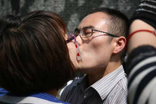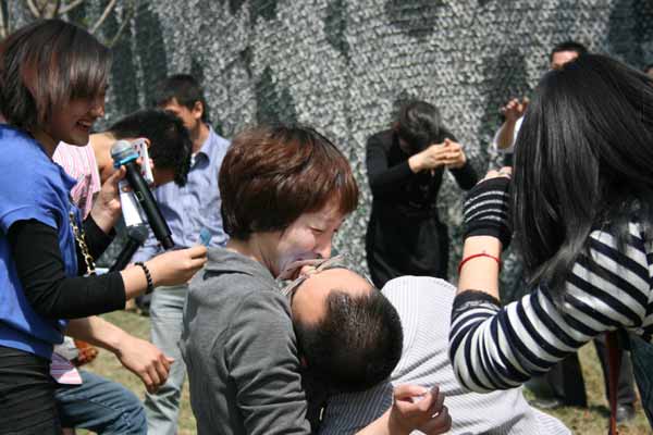 中國寧波網(wǎng)手機(jī)記者138****8389:某單位在春游活動(dòng)中的一項(xiàng)游戲,5對男女進(jìn)行分組接吻傳遞撲克牌。不過,規(guī)則是不可以吻到對方,只能吻住撲克牌喲,更不能有其他想法喲,呵呵。