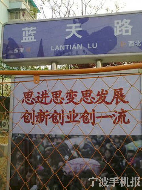 中國寧波網(wǎng)手機(jī)記者139****5400:藍(lán)天路路標(biāo)指示牌下的宣傳欄內(nèi)將寧波三思三創(chuàng)內(nèi)容順序?qū)戝e了,應(yīng)該是先創(chuàng)業(yè)、再創(chuàng)新、再來創(chuàng)一流!宣傳欄內(nèi)可不能犯這樣的錯誤哦!
