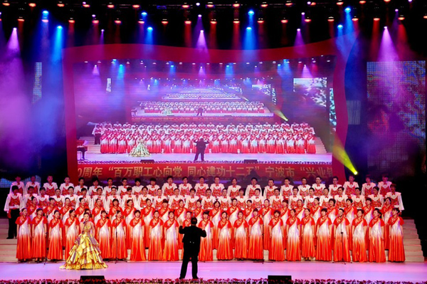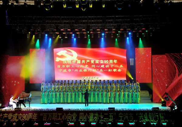 中國寧波網(wǎng)手機記者137****6468:20日下午,由寧波市總工會主辦的“百萬職工心向黨,同心建功十二五”五一紅歌會在寧波市體育館拉開帷幕。參加這次紅歌會演唱的單位有來自寧波各縣(市)區(qū)工會以及工業(yè)、直屬、建設、財貿(mào)、文衛(wèi)工會的17個企業(yè)合唱隊,他們在這里一展歌喉,頌歌頌黨。最后2600多名來自寧波各縣(市)區(qū)的職工代表一齊起立,高歌《沒有共產(chǎn)黨,就沒有新中國》!!
