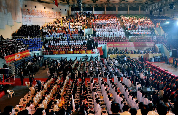 中國寧波網(wǎng)手機記者137****6468:20日下午,由寧波市總工會主辦的“百萬職工心向黨,同心建功十二五”五一紅歌會在寧波市體育館拉開帷幕。參加這次紅歌會演唱的單位有來自寧波各縣(市)區(qū)工會以及工業(yè)、直屬、建設、財貿(mào)、文衛(wèi)工會的17個企業(yè)合唱隊,他們在這里一展歌喉,頌歌頌黨。最后2600多名來自寧波各縣(市)區(qū)的職工代表一齊起立,高歌《沒有共產(chǎn)黨,就沒有新中國》!!